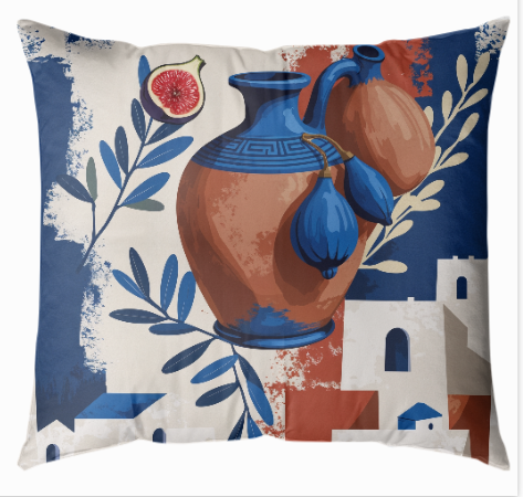 Bu 43x43 cm’lik özel tekstil tasarımı, Yunan kültürü ve Akdeniz ruhunu soyut ama zarif bir biçimde bir araya getiriyor.