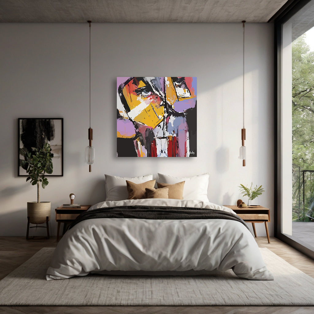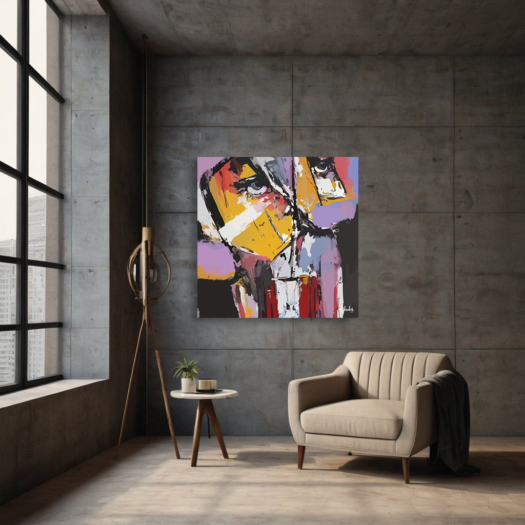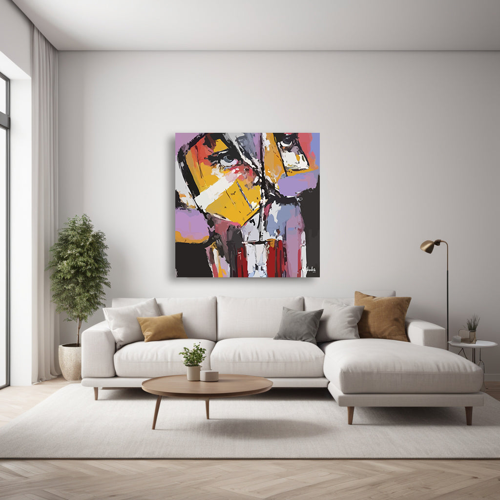 Sanatçı Dikuka, bu dijital eserde benliğin maskelenmiş yüzlerini, çarpıcı renk blokları ve bölünmüş formlarla ortaya koyar. Sarı ve kırmızının keskin geçişleri bir öfke ve savunma katmanıyken, araya sıkışan morlar ve beyazlar kırılganlık ve bastırılmış duyguların izlerini taşır.