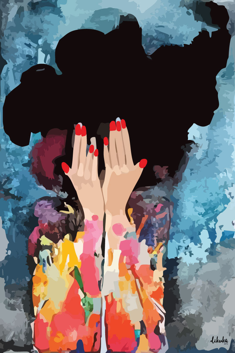 “Kimlik”, bireyin kendini ifade etme biçimini yüzünün ötesine taşıyan güçlü bir dijital eser. Sanatçı Dikuka, bu çalışmasında bir kadın figürünü yüzünü kapatmış halde sunarken, onun tarzını – parlak ojeleri, cesur renklerdeki giysisi – öne çıkarıyor.