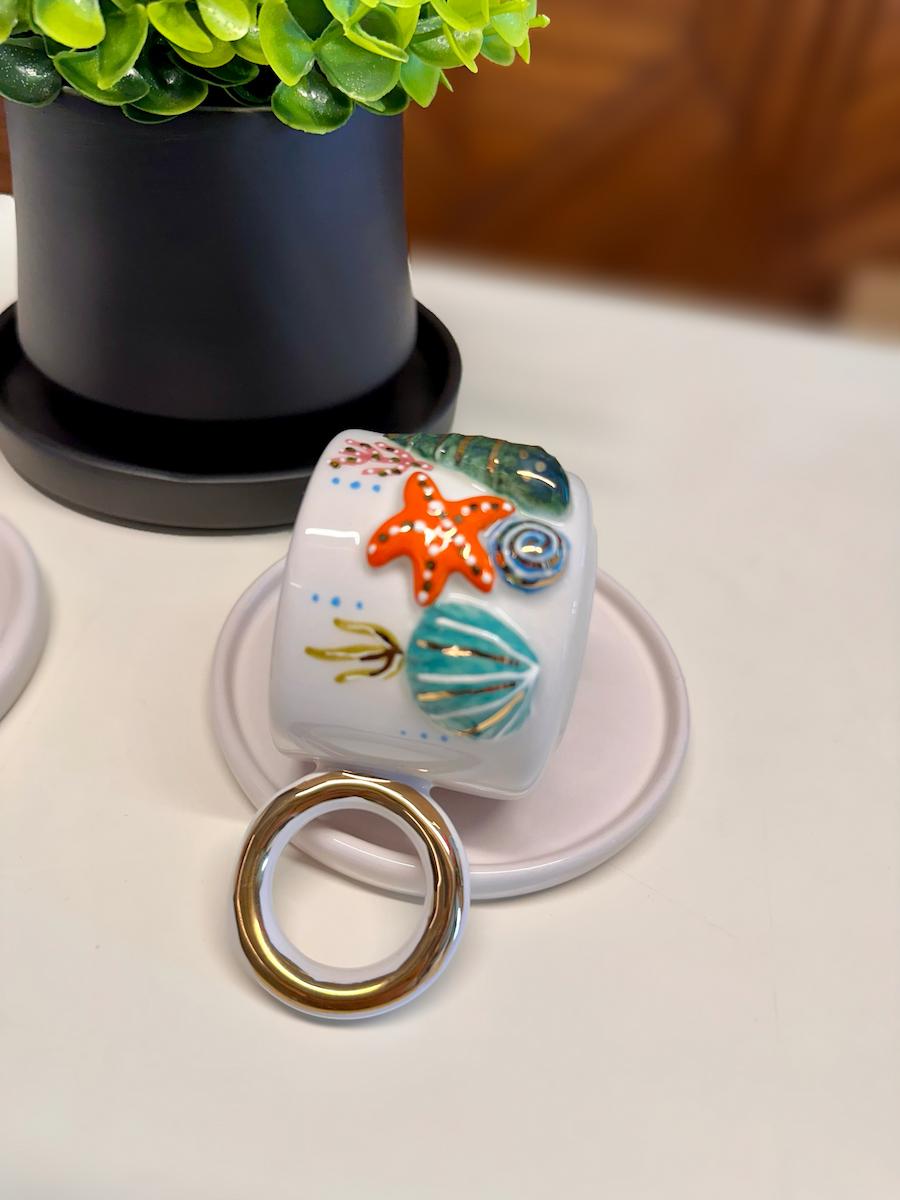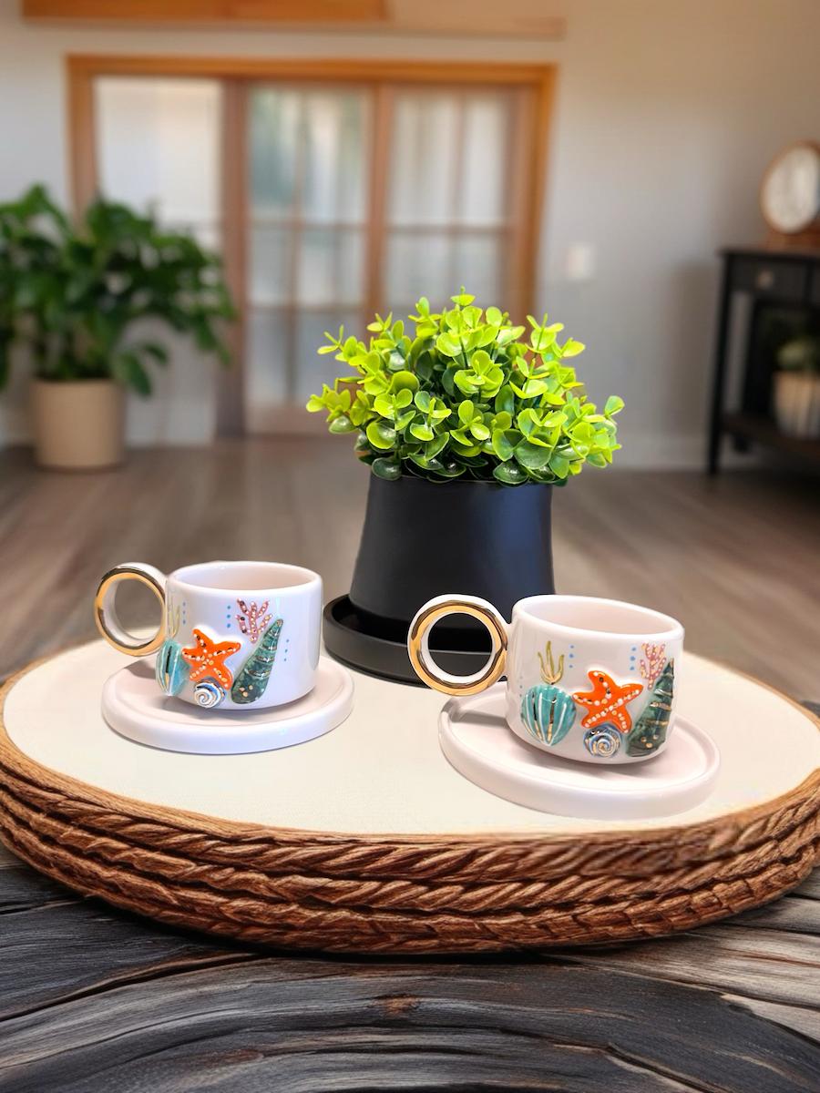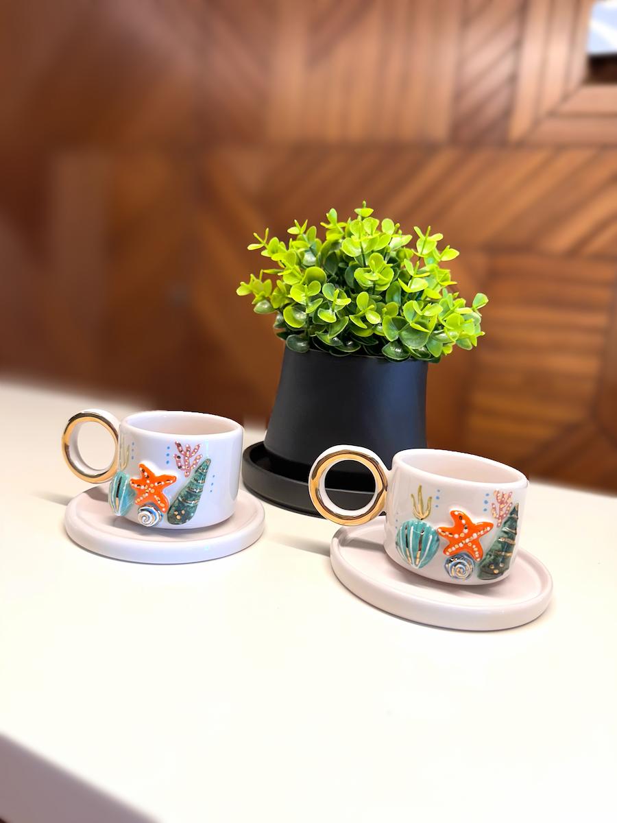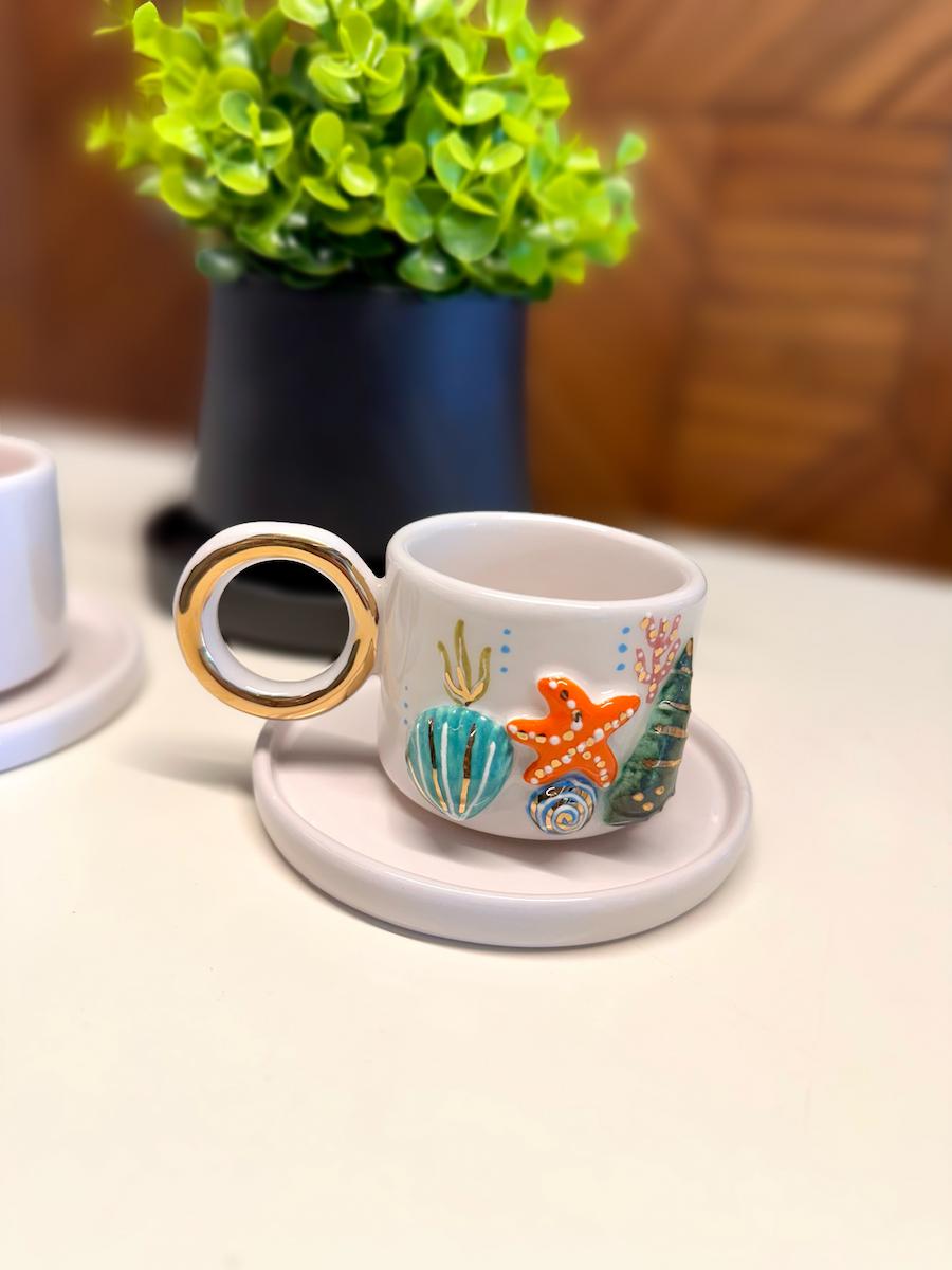 Her yudumda sahil serinliği, deniz tuzunun ferahlığı... “Denizden Gelen Mucize” el yapımı seramik fincan, okyanusun kalbinden kopup gelmiş gibi. Üzerindeki yıldız balığı, deniz kabukları ve mercan detayları; her kahve keyfini bir tatil anısına dönüştürüyor. Doğayla iç içe bir sanat eseri olan bu özel fincan, sadece kahve içmek değil, huzuru avuçlarına almak isteyenler için tasarlandı.