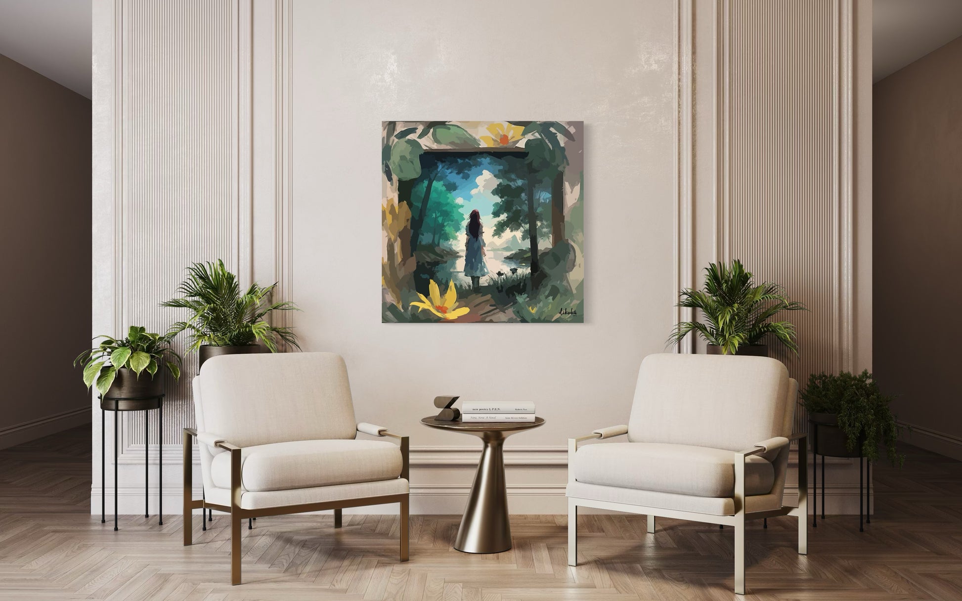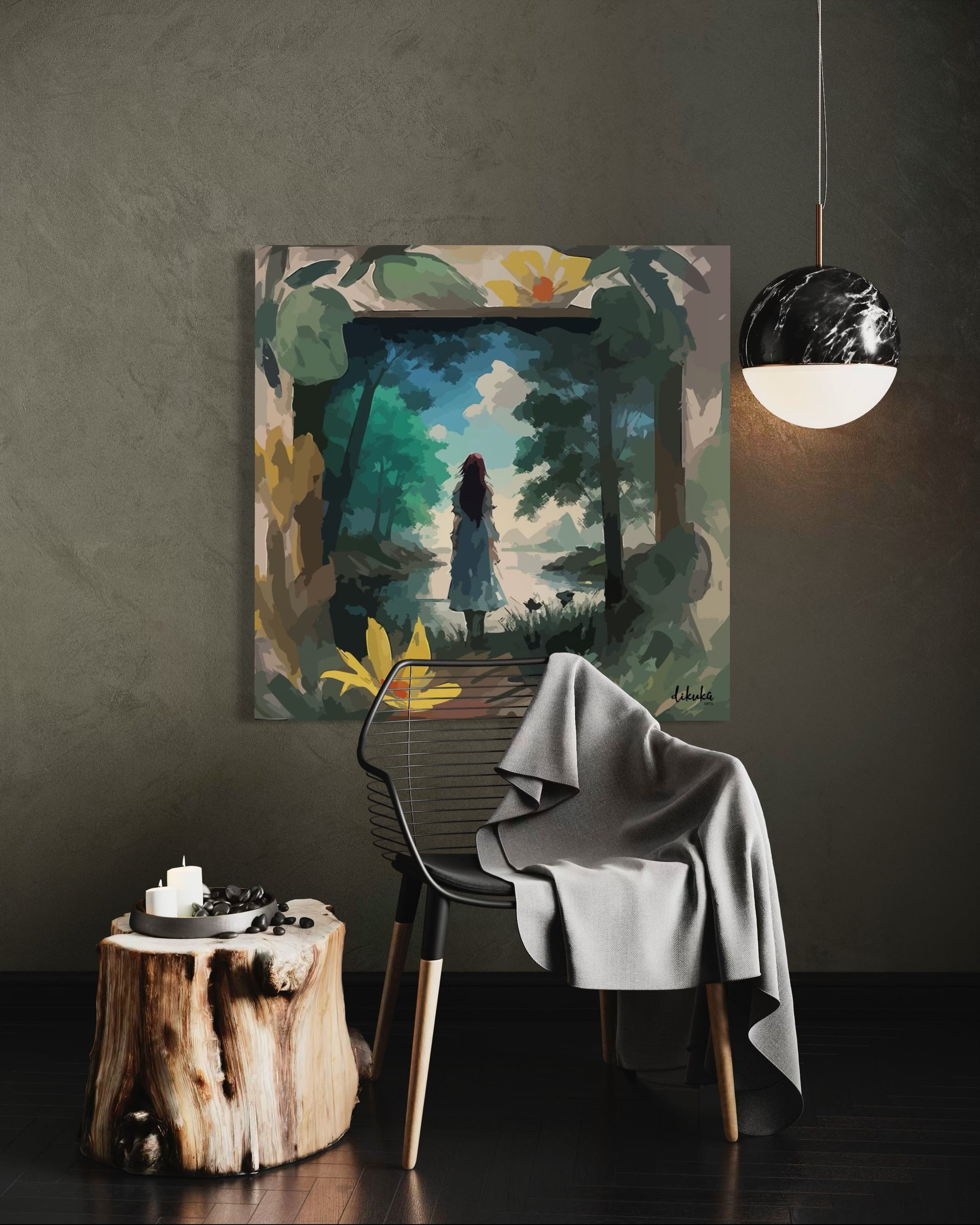 Doğanın içinde yalnız başına duran kadın figürü, dışarıya bakıyor gibi görünse de aslında kendi içine bakıyor. Gölün sessizliği, ağaçların koruyucu gölgeleri ve çiçeklerin zarif dokunuşu; onun iç dünyasının yansımalarıdır.