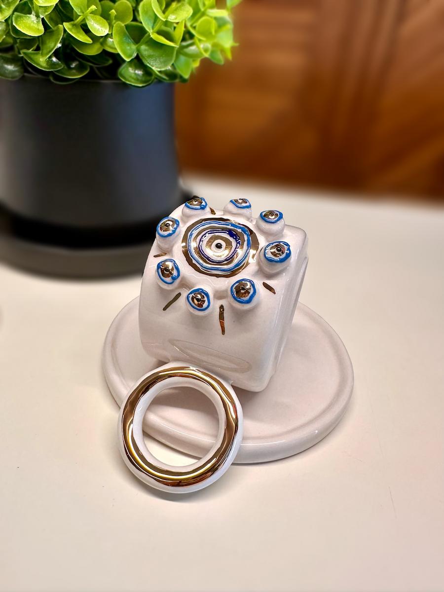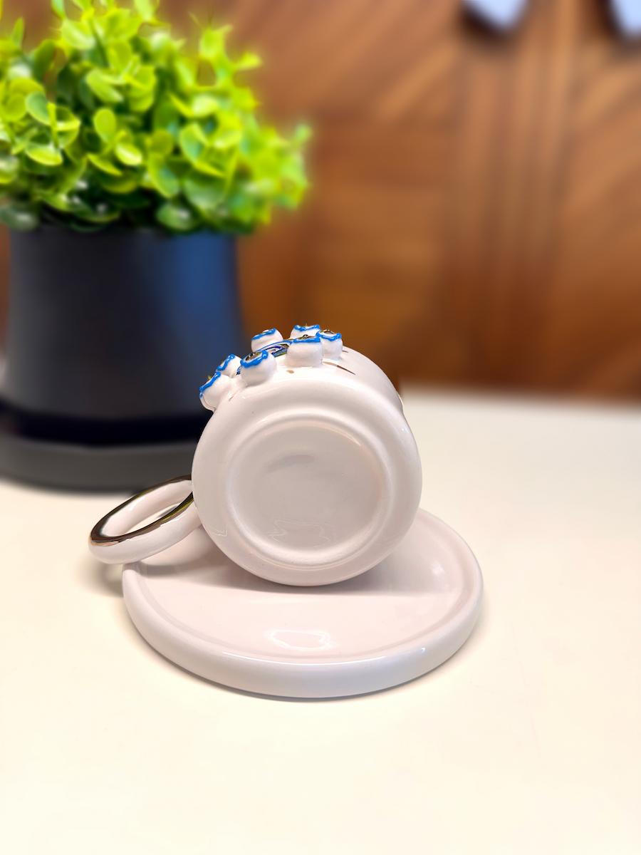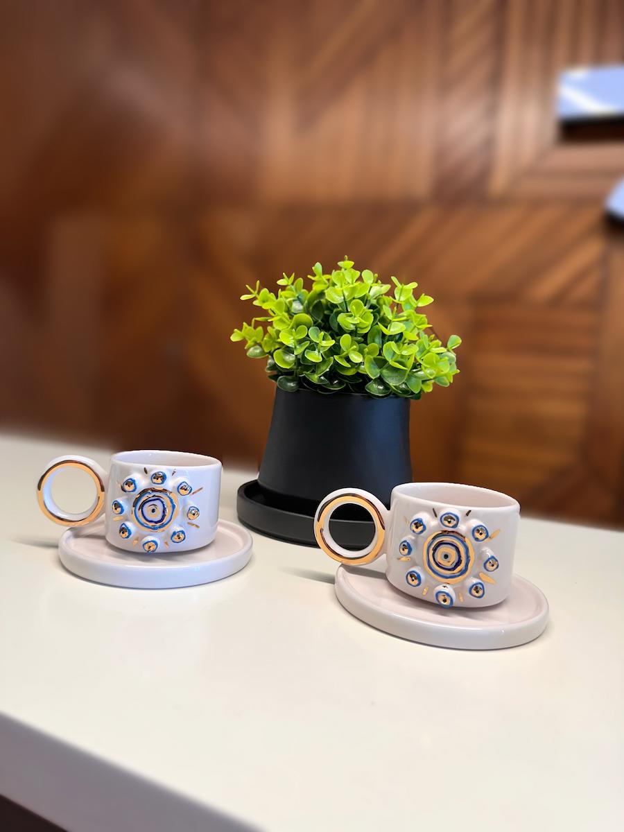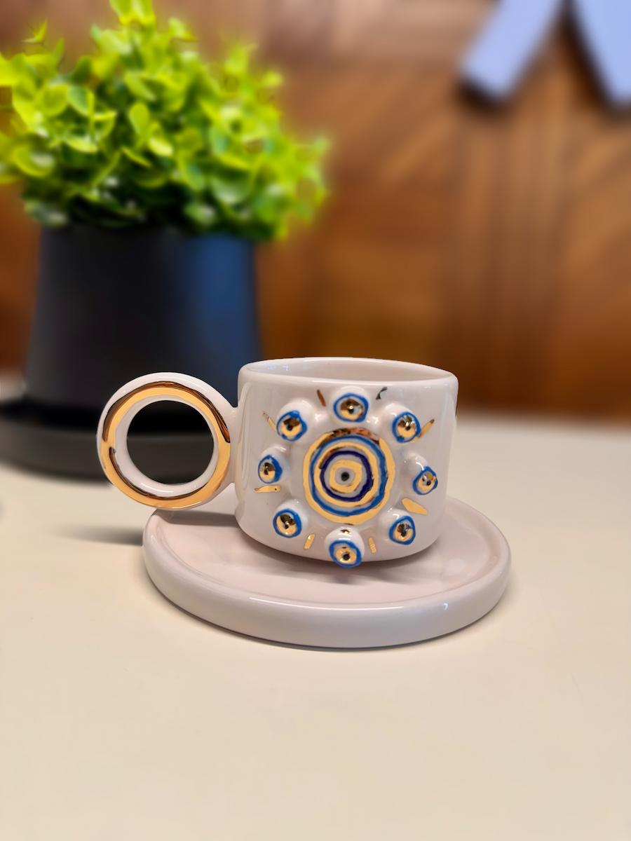 "Şifa Çemberi", göz alıcı nazar boncuğu desenleriyle, kötü enerjileri uzaklaştırmaya niyetlenen özel bir tasarım. Her bir çember, sevgiyle çizilmiş bir koruma halkası gibi… El işçiliğinin zarafetiyle bütünleşen bu fincan, yalnızca kahve içmek için değil, huzurla anı yaşamak için var.