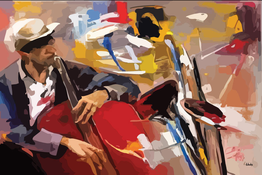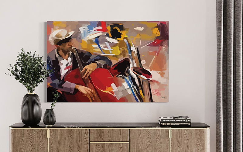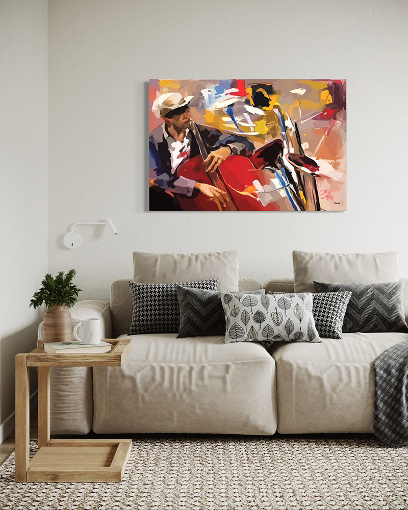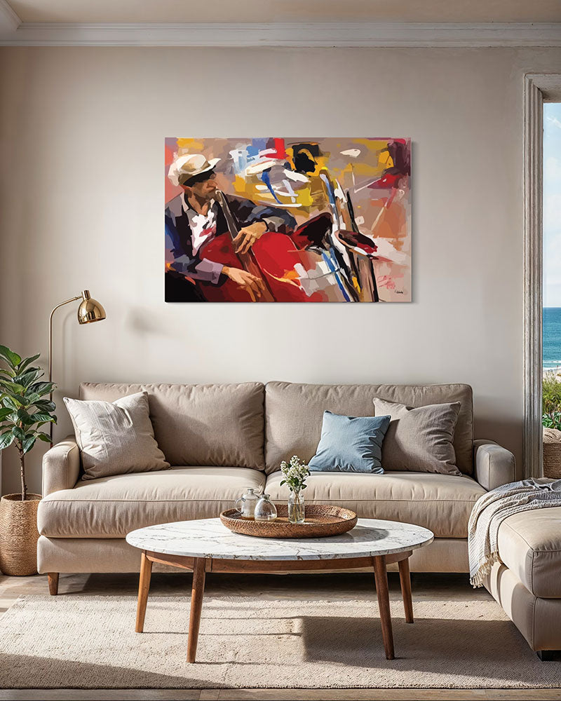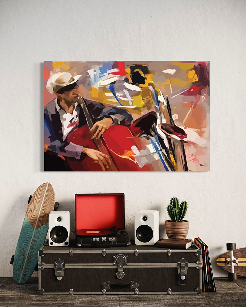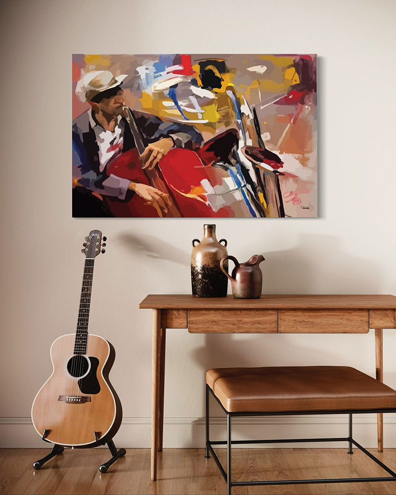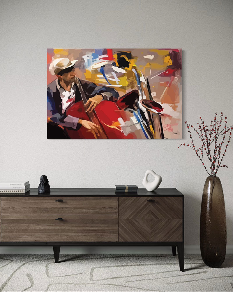 Renklerin armonisiyle hayat bulan “Sokakların Ritmi”, bir çello sanatçısının caz esintileriyle dolu anını yakalıyor. Arka planda saksofonun soyut dokunuşları, müziğin görsel bir dansa dönüştüğü bu eserde izleyiciyi kendi hayal ritmine davet ediyor.