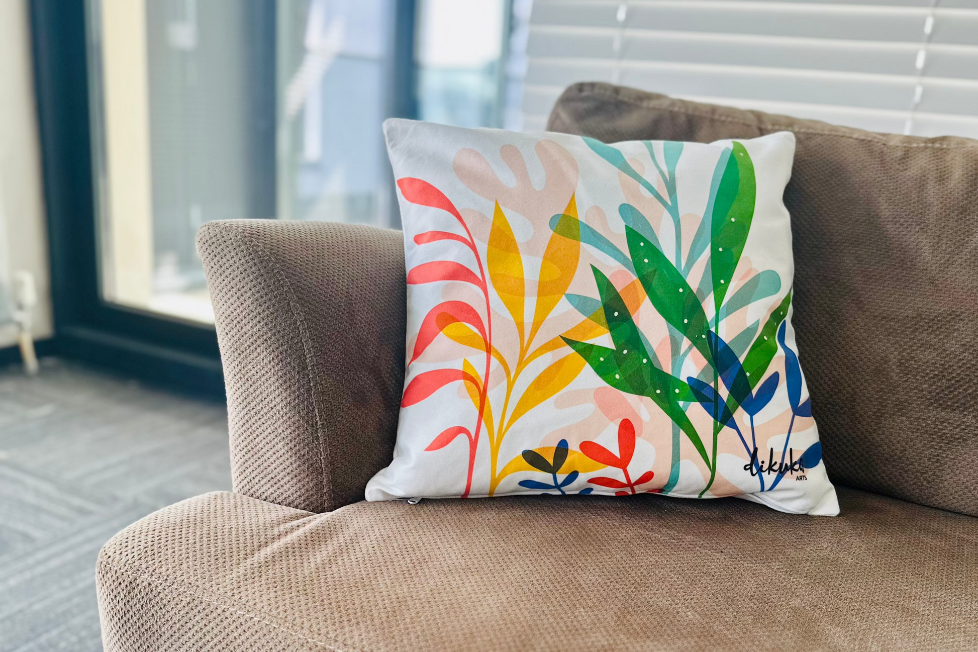 Tropikal doğanın enerjisini evinize taşımak ister misiniz? Canlı yeşil, turuncu ve mavi tonlardaki yaprak desenleriyle hazırlanan bu 43x43 cm yastık kılıfı, hem dinamik hem de doğayla iç içe bir dekorasyon sunar.
