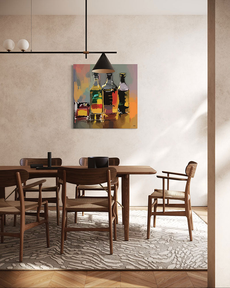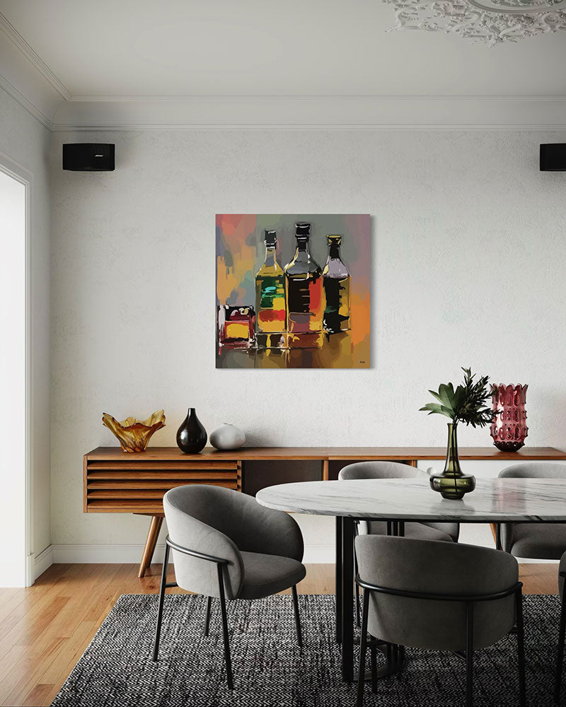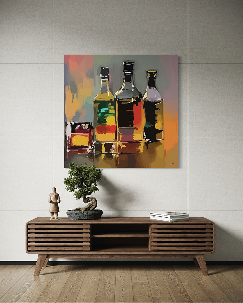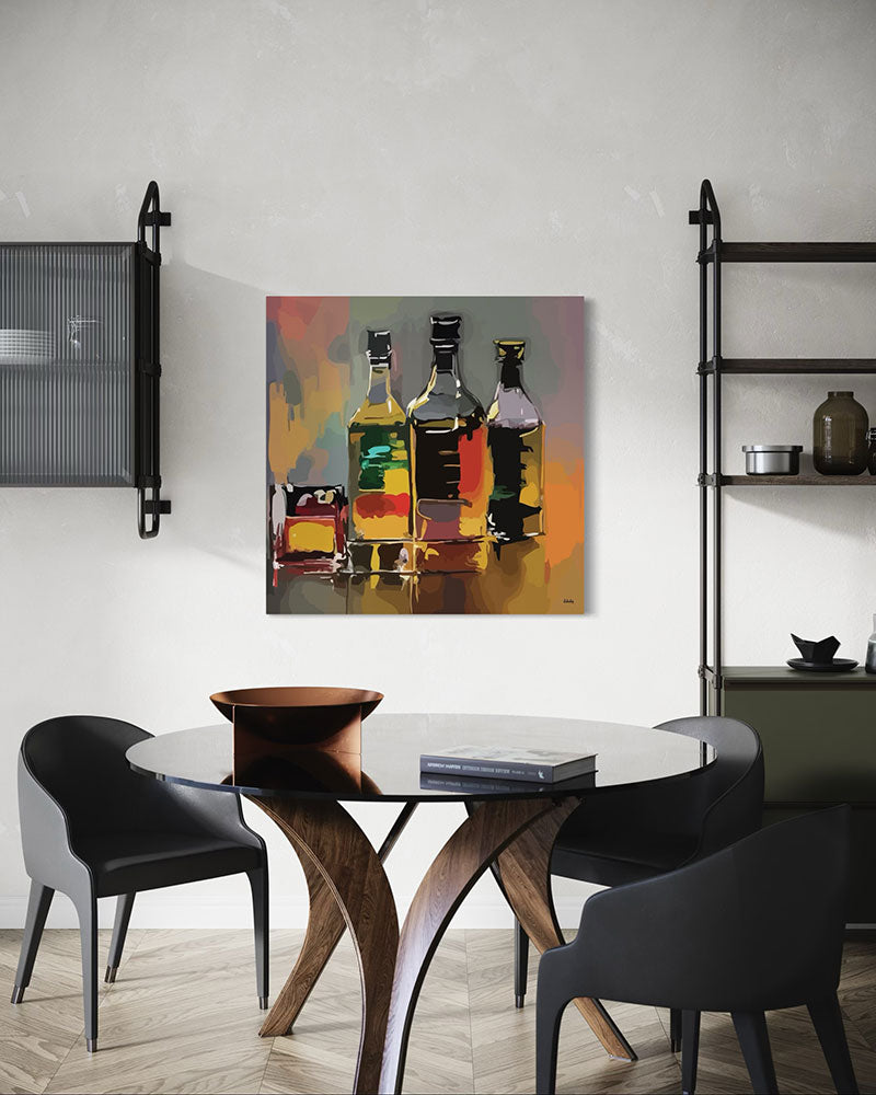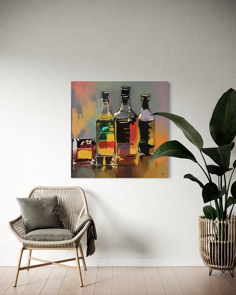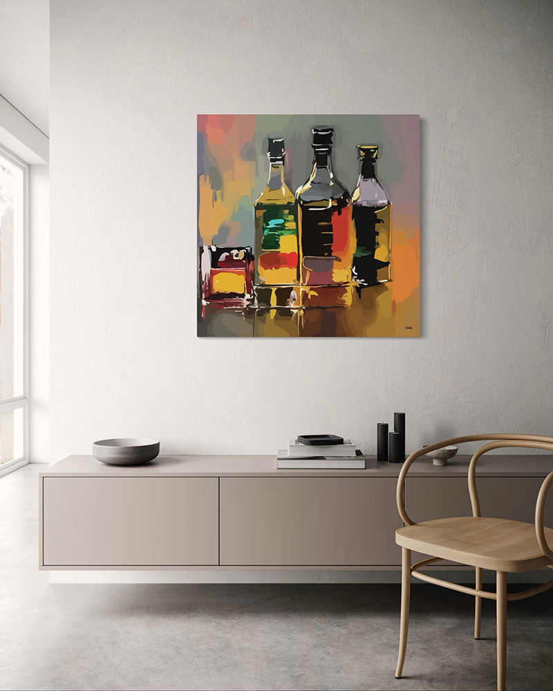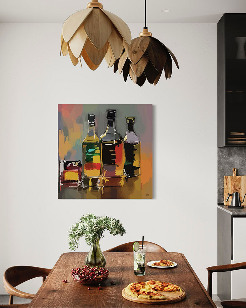 Bu tablo, damakta kalan aromalar gibi iz bırakır; hem stil sahibi alanlara görsel bir tat katar, hem de viski severlerin ruhuna hitap eder. Keyifli sohbetlerin, yalnız gecelerin ve zarif anların sessiz tanığı...