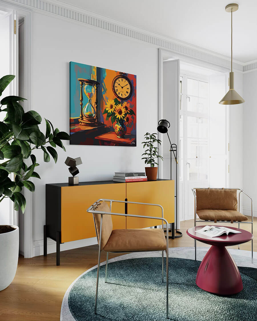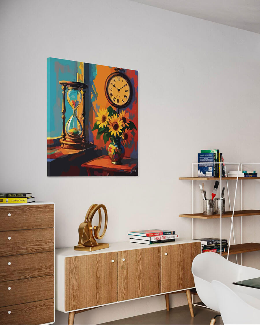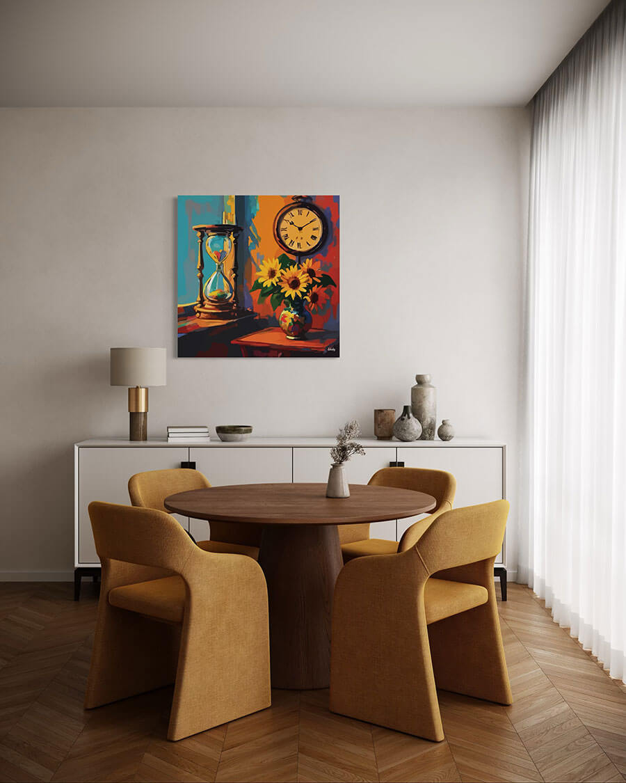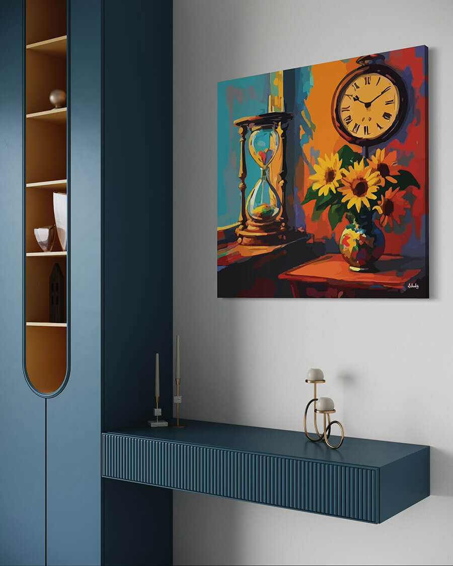 Güneşli bir günün sıcaklığı pencere kenarına vururken, içeride zaman başka bir ritimde akıyor. Kum saati yavaşça süzülüyor, duvardaki saat usulca ilerliyor. Bir vazonun içindeki ayçiçekleri ise, bekleyişin sessizliğinde, zamanı kendi dillerince hissediyor. “Zamanın Çiçeği” tablosu, insanın içsel bekleyişini, umudu ve geçmek bilmeyen anları sembollerle anlatıyor. Her detay, zamanla olan ilişkimize dair sessiz bir hikâye fısıldıyor.